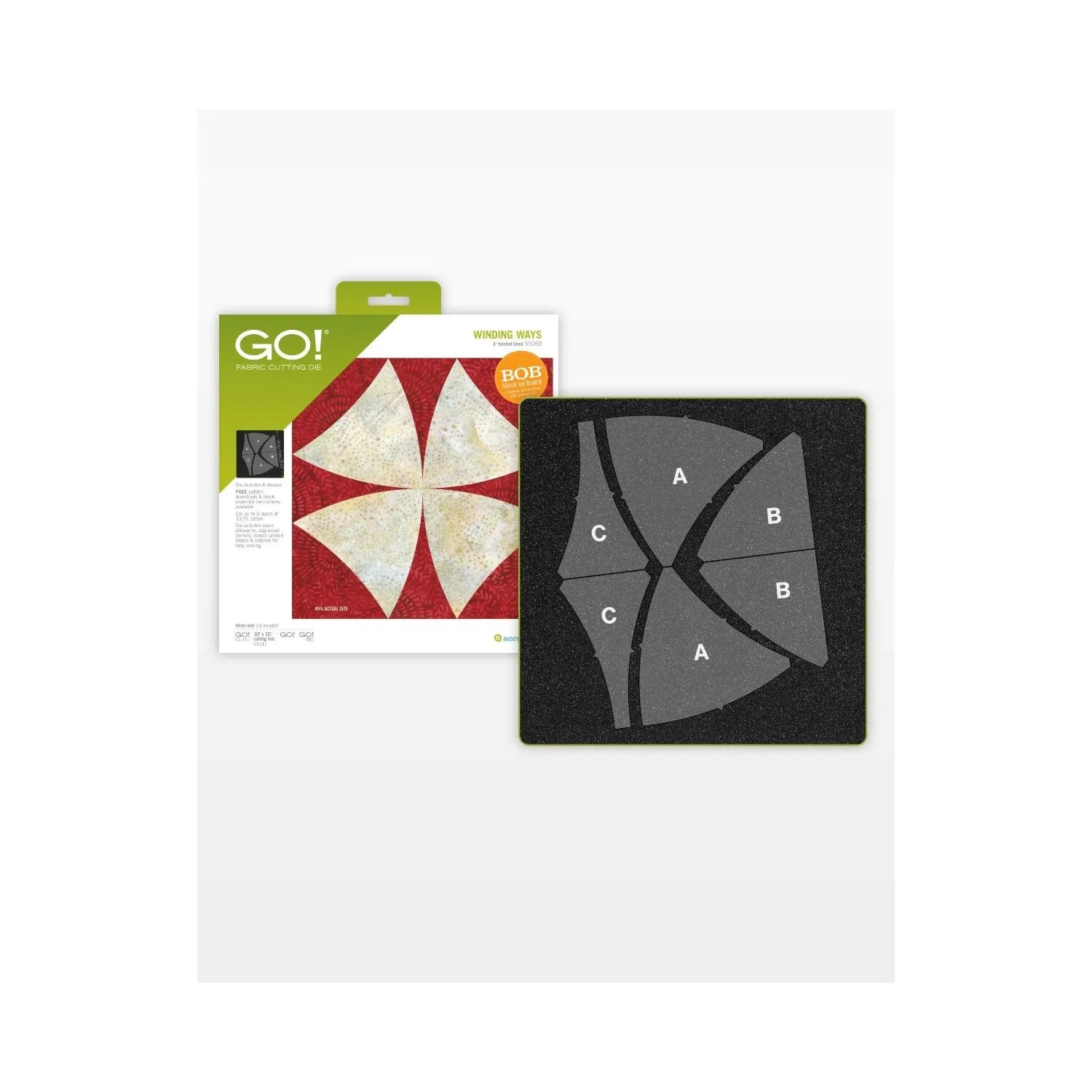 Cutting skinny then wide, curved sided pieces of the Winding Ways pattern is a trick. This GO! precision cutting die makes taking the winding way a breeze. It features matching notches on curved seams for easy pinning and quick sewing. Creates an 8" finished square.