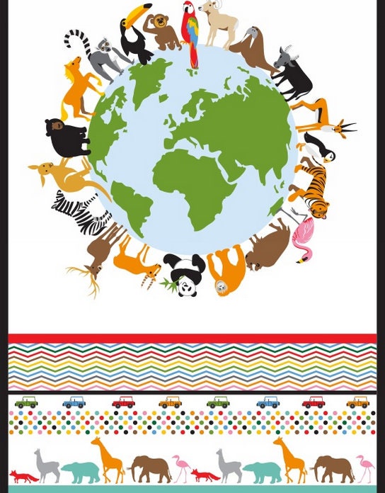"A global view to the animals we love and where we live as explorers on the Earth. An animal patchwork, a border stripe, two panels and a fabric storybook all completed with a nice selection of tossed animal prints. A word print with the continents serve as a teaching tool for project makers who want to serve their school aged young ones."