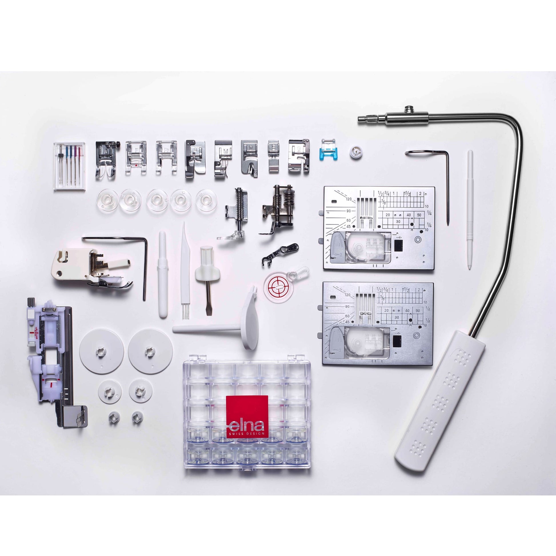 - 15 presser feet, 2 needle plates and 10 Easy bobbins