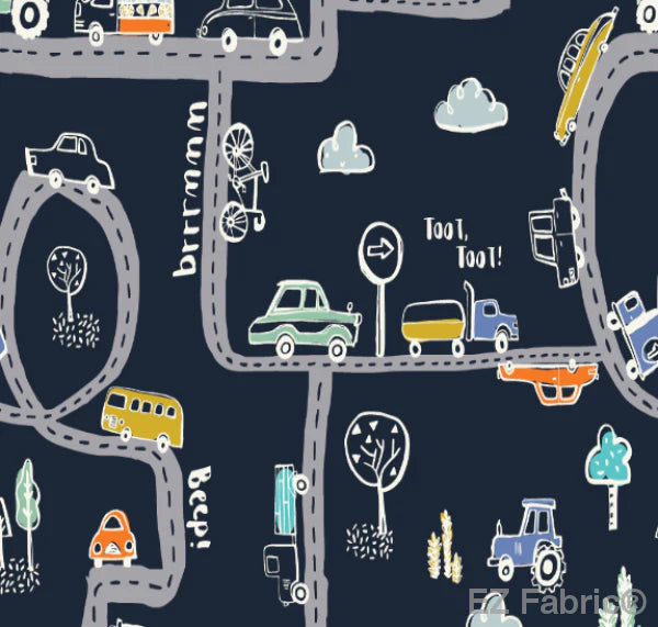 Beep Beep! Take your little roadster on an adventure with this playful On the Road Minky. Featuring Trucks, Buses, and Motorcycles, this silky soft and cuddly material is great for playtime.